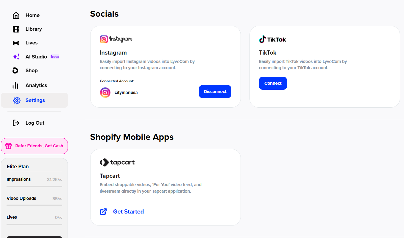 Purpose: This guide shows you how to connect your brand’s social media accounts to LyveCom so you can upload videos directly to your channels.
