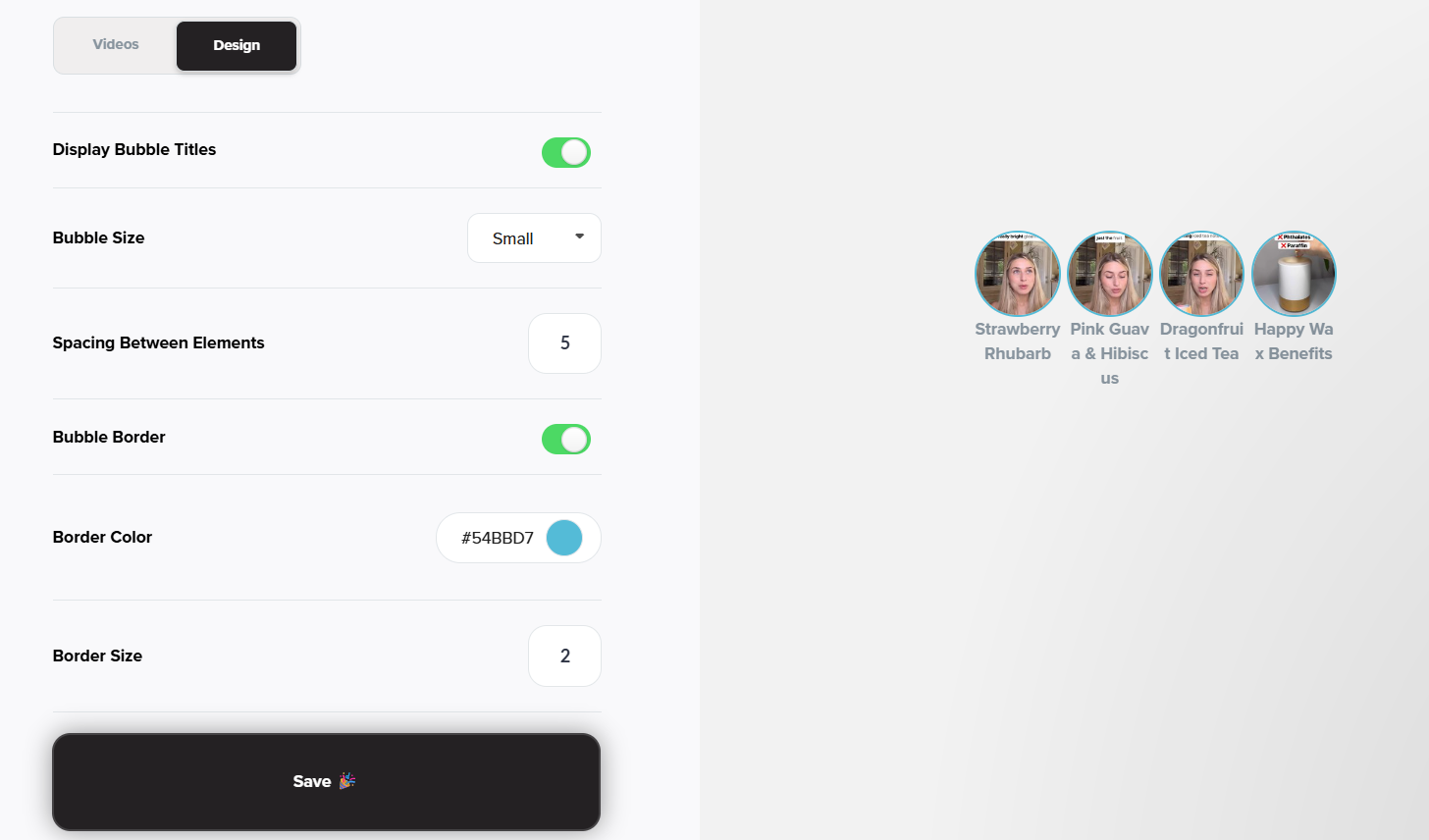 Once you’ve finished editing both the Videos and Design tabs, hit Publish Bubble to save and generate your embed code.