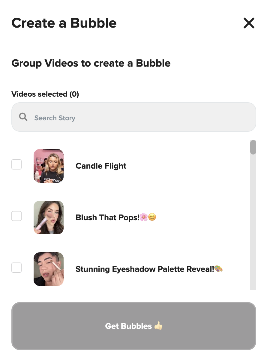 When creating or editing Bubbles, you'll land on the Videos tab first.