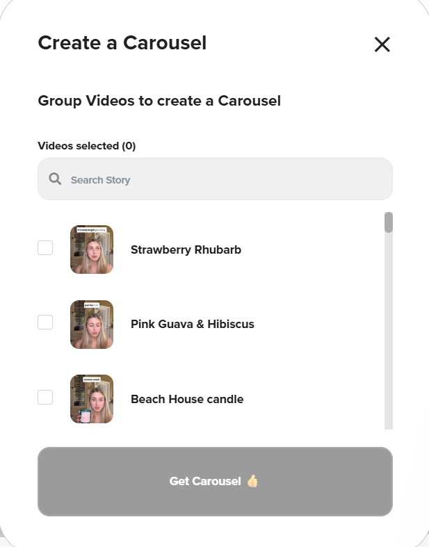 Carousels are endlessly scrollable shoppable video feeds that can be embedded on your website. They’re perfect for showing off tutorials, UGC, product demos, and before-and-after transformations.