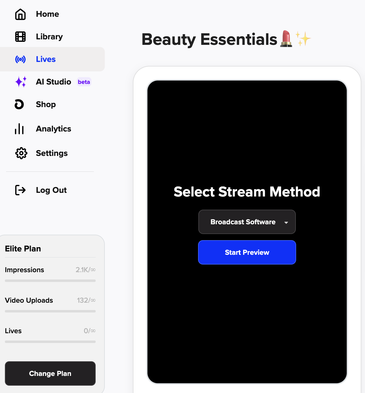 Head over to your LyveCom dashboard and open a scheduled live event. Select Broadcast Software as the stream method, and click Start Preview.