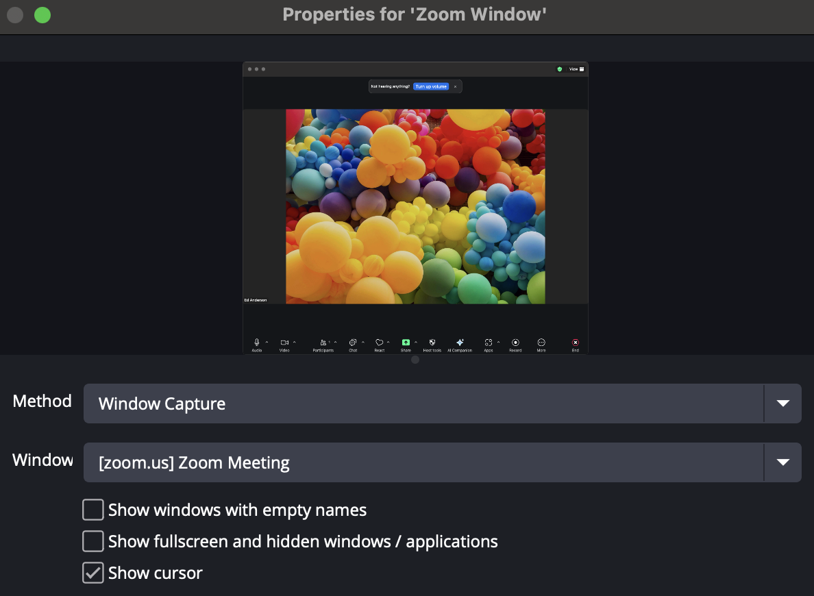 💡 Tip: Make sure your Zoom meeting is open and visible in desktop view before selecting it in OBS.