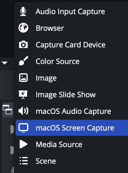 Under Sources, click the ➕ icon and choose macOS Screen Capture (or Window Capture).