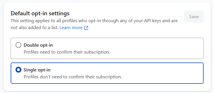 Back in Klaviyo's API Settings, scroll down to Default Opt-In Settings and select Single Opt-in