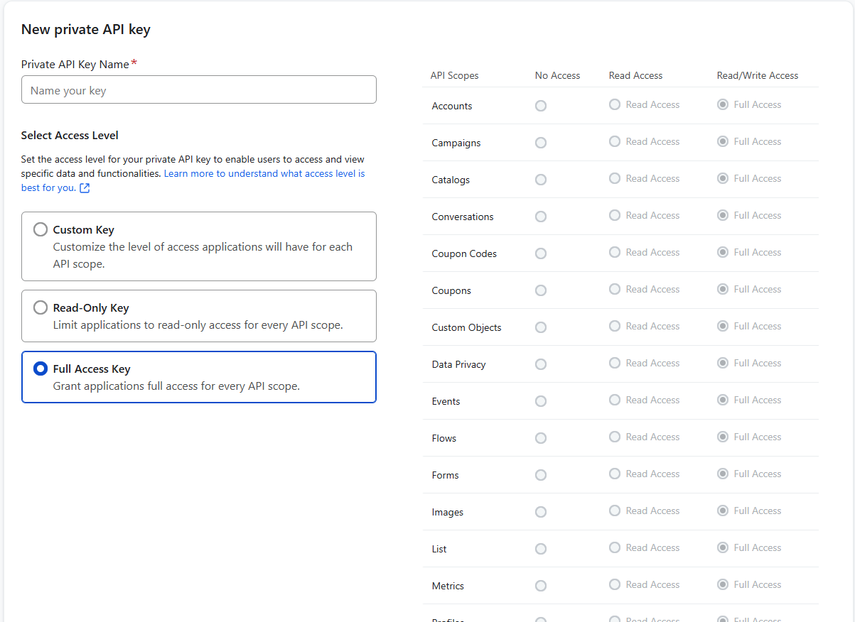 Within Klaviyo again, create a Private API, title it LyveCom and select Fully Access Key