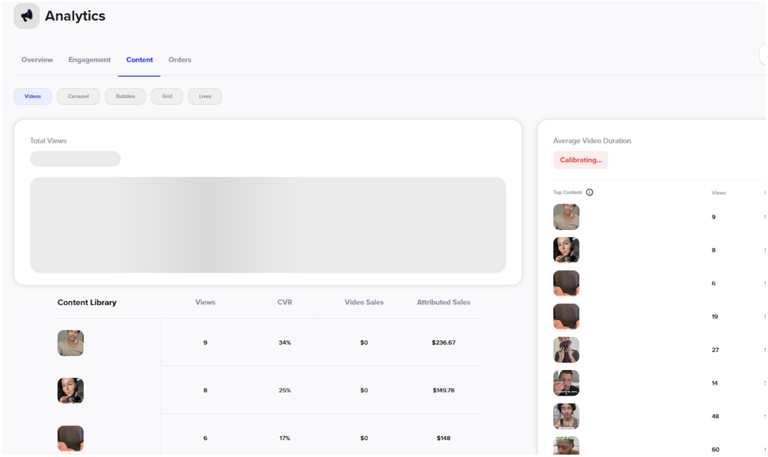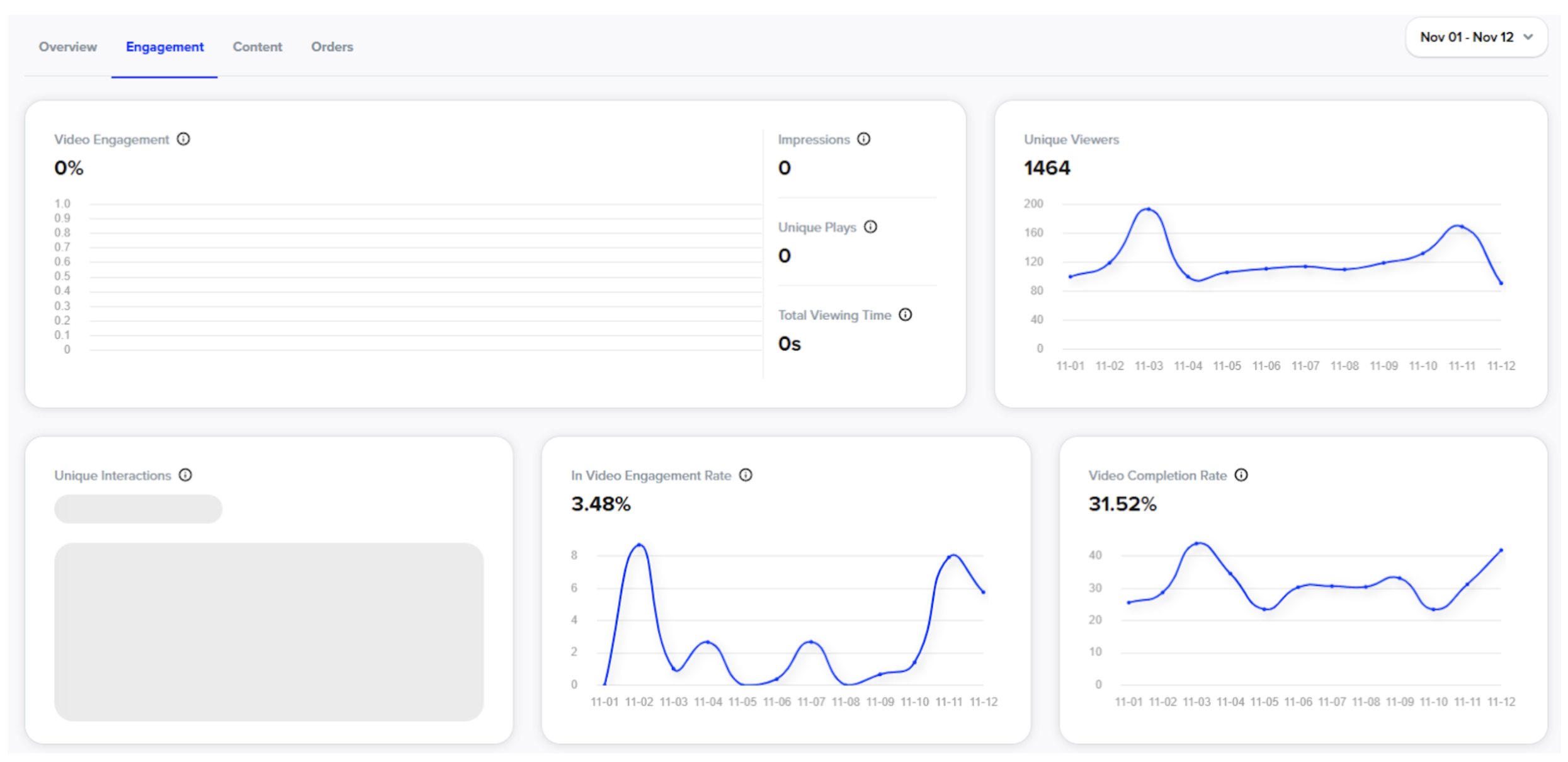 Engagement Tab: | Breakdowns of engagement how many individual people are interacting with the videos. It shows % of customers that interact once they click into a video (In Video Engagement Rate). | These segmentations help you understand how engaged your audience is. | If engagement drops, consider adding new videos, changing placement of videos, or changing the creators of the videos. Different creators will engage different customers. |