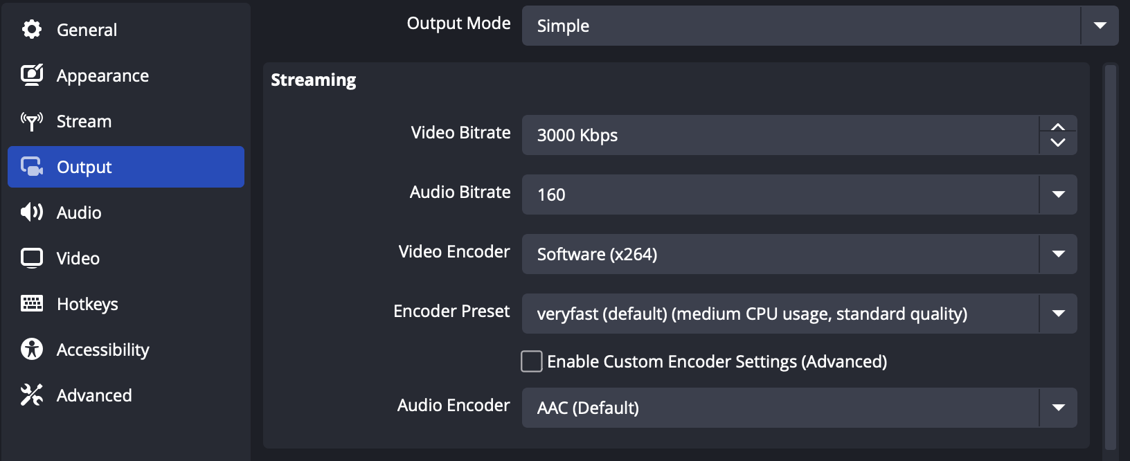 In OBS, navigate to Settings → Output