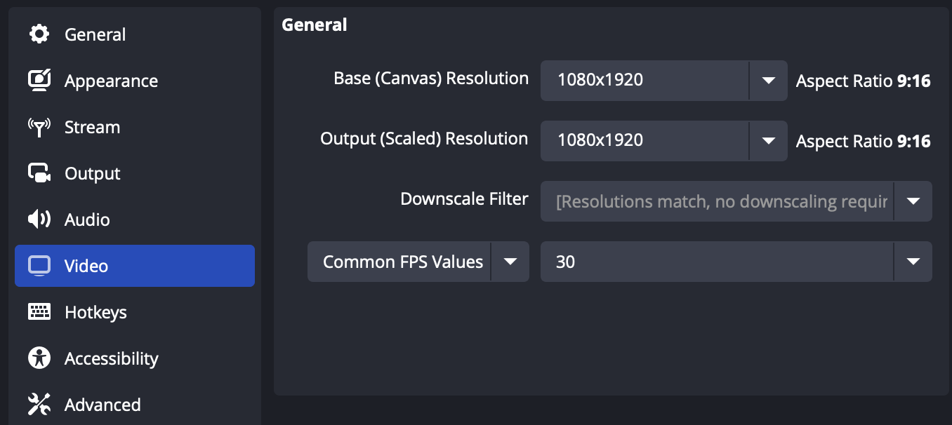 Open OBS and go to Settings → Video