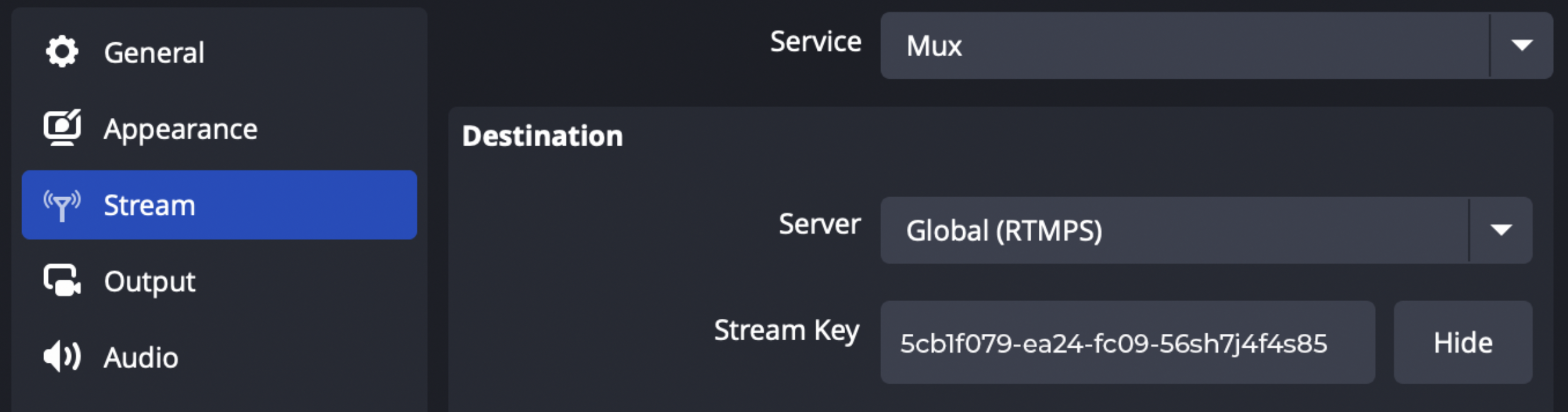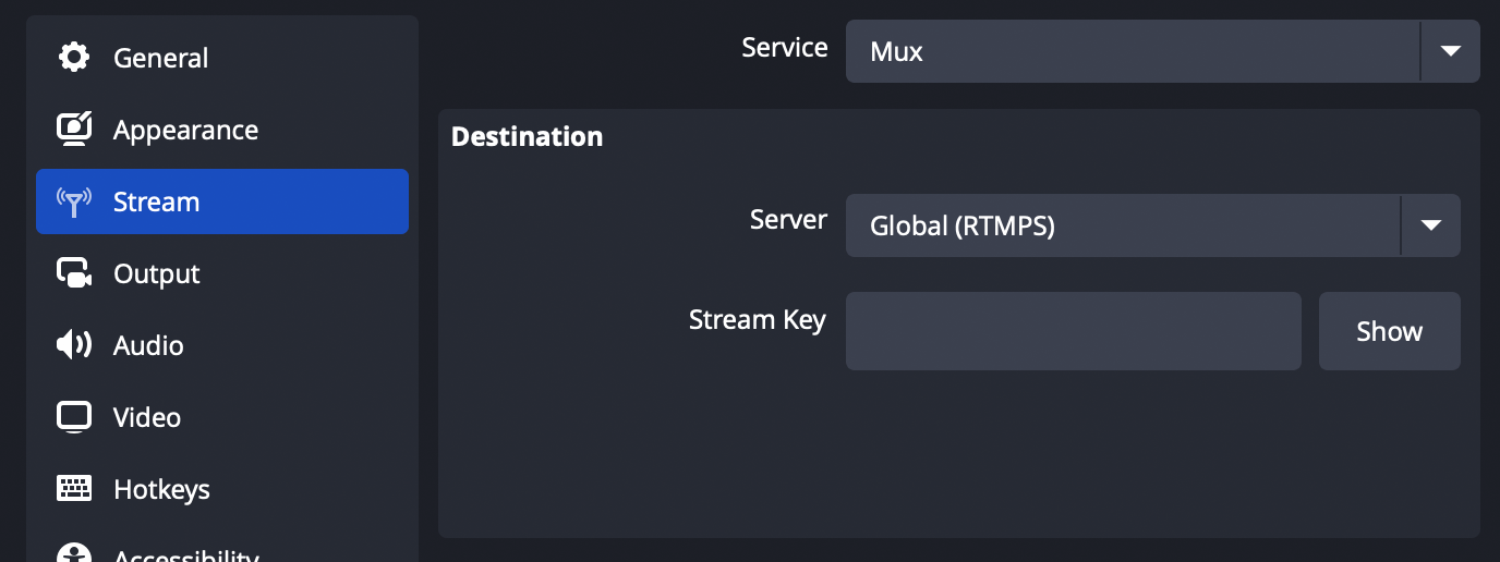 /app/in your RTMP link. Paste your Stream Key into the OBS Stream Key field.