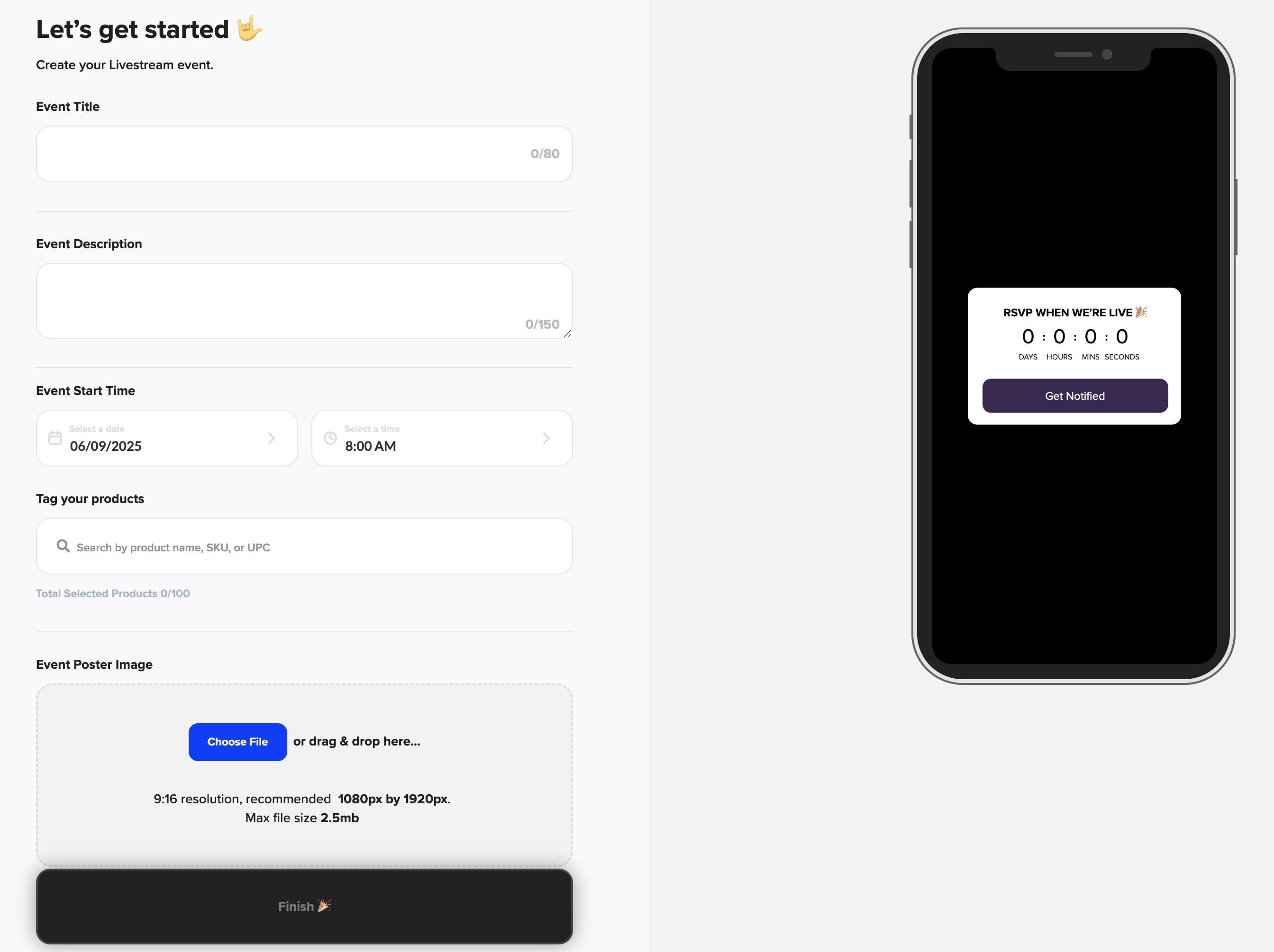 Once all details are complete, hit Finish to officially schedule your livestream.