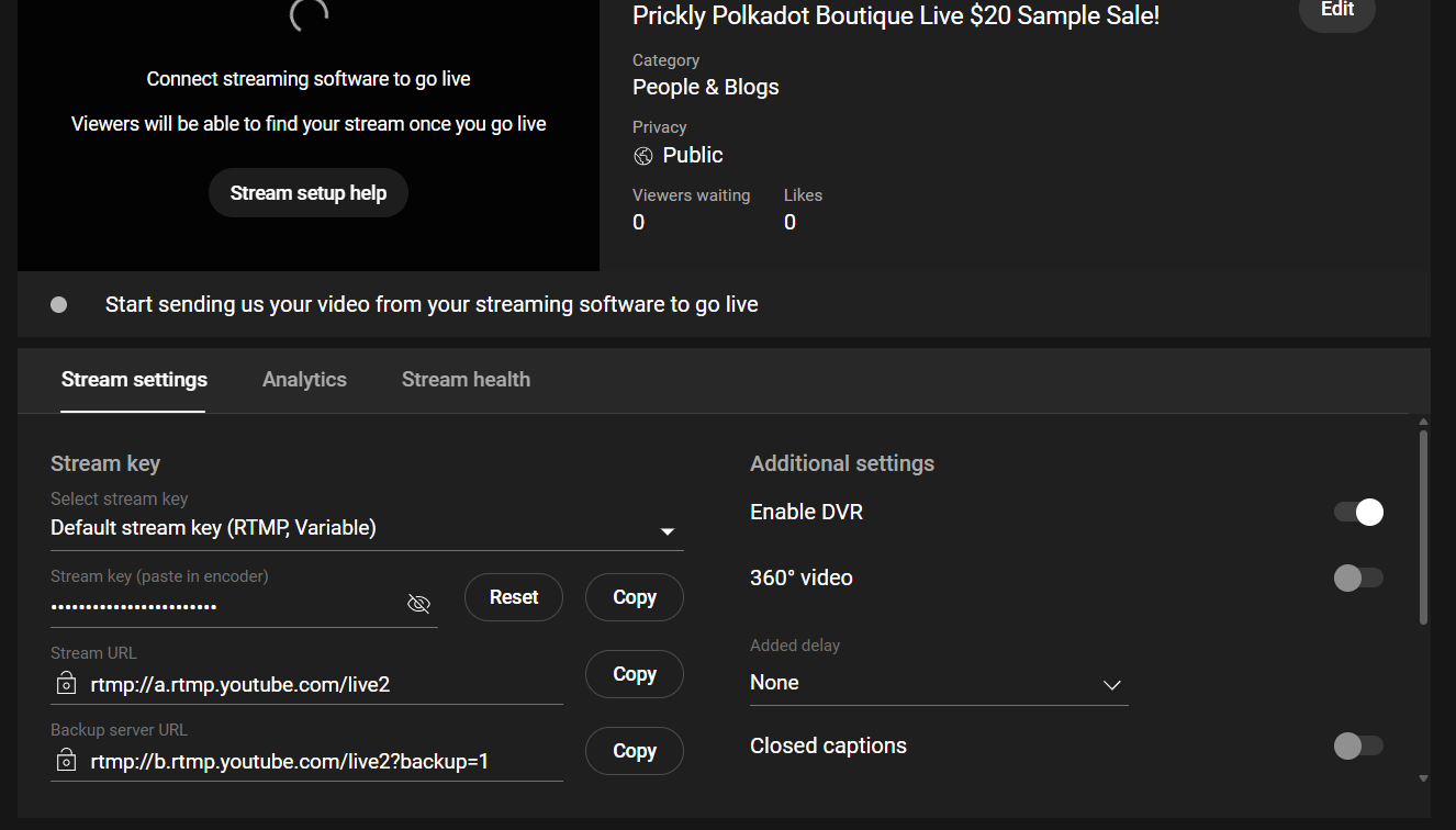 You’ll need a Stream URL and Stream Key from each platform you want to stream to. Open each platform in a separate browser tab—but do not close any tabs until your livestream is complete.