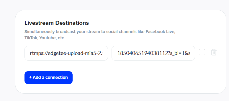 Click Add Connection to begin linking external platforms like YouTube, TikTok, Facebook, or Instagram