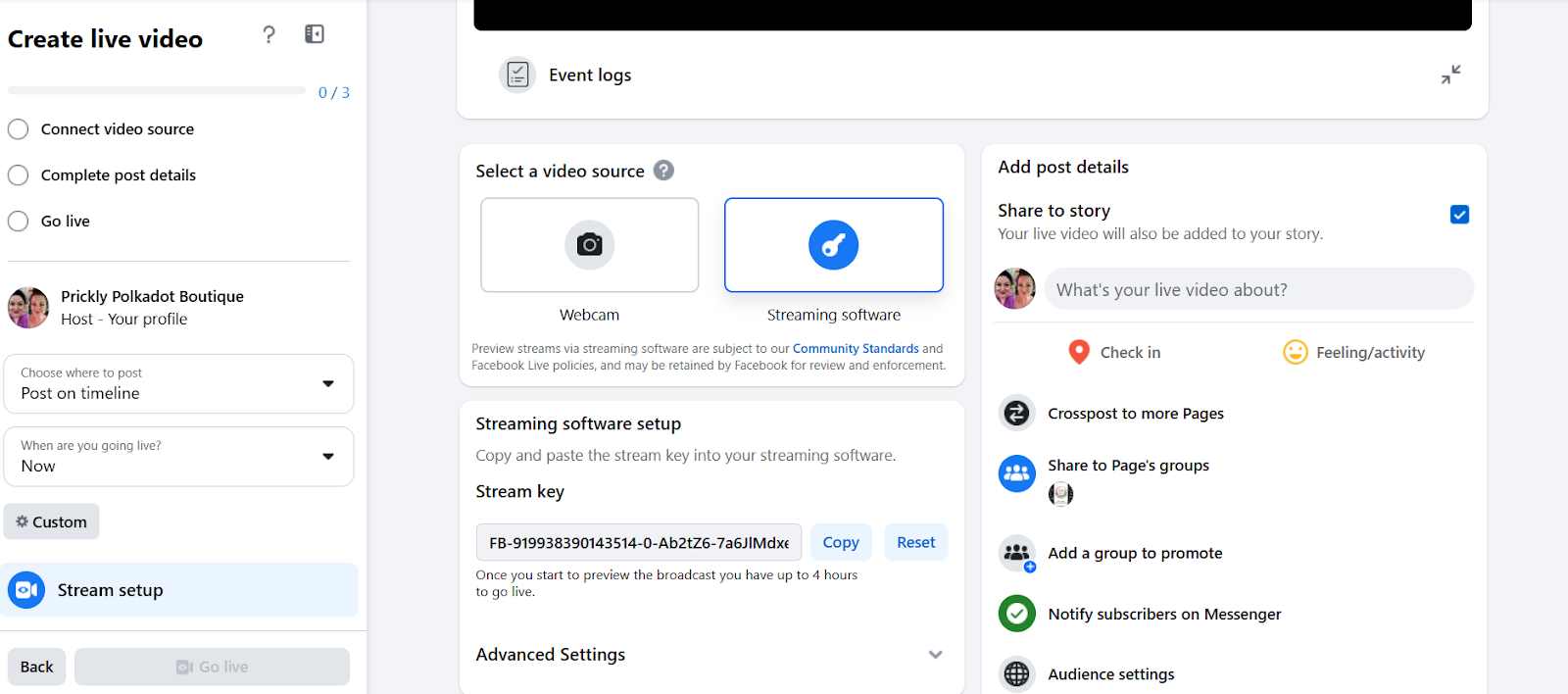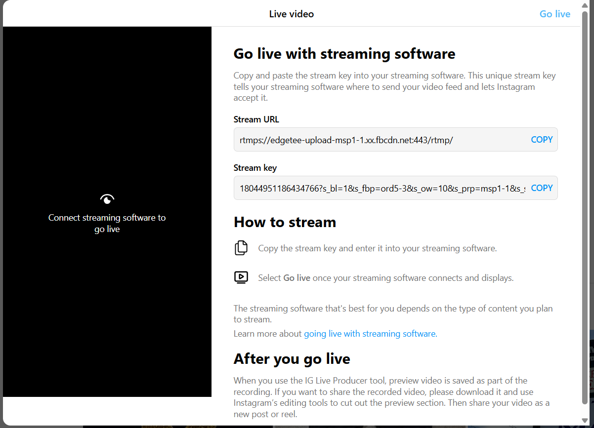 Platforms other than Facebook require a new stream key each time you go live.
