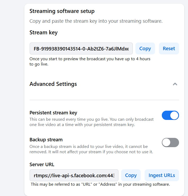 Facebook only needs to be set up once, thanks to Persistent Stream Key.
