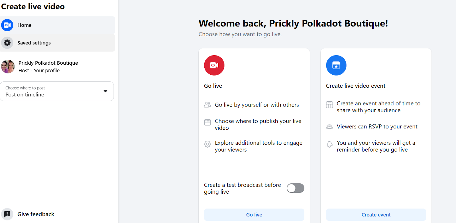 In your Facebook Business Account, select Live Video