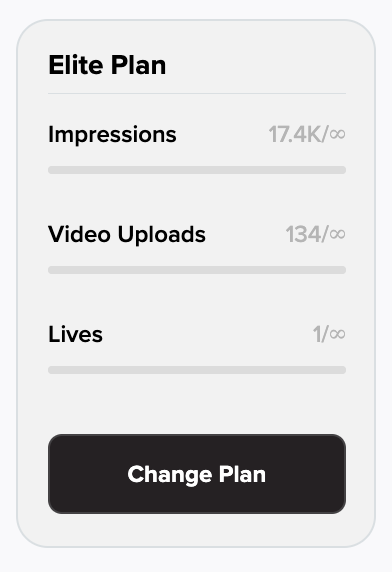 Look in the bottom left-hand corner—you’ll see your current subscription info and usage details (Impressions, Video Uploads, Lives).
